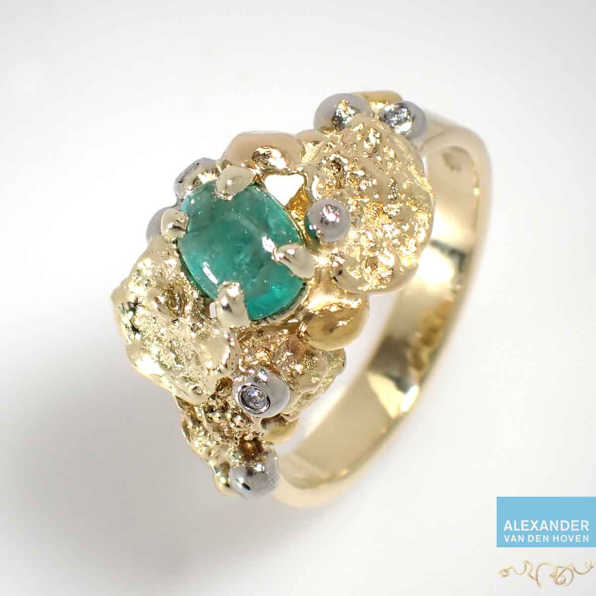Geelgouden en platina ring met smaragd en diamanten. Dit is een grillige en glad-ruwe ring waarbij de edelstenen en 18K ruwe delen en platina bolletjes als glanzende kiezelsteentjes in een ondiep beekje lijken te liggen.